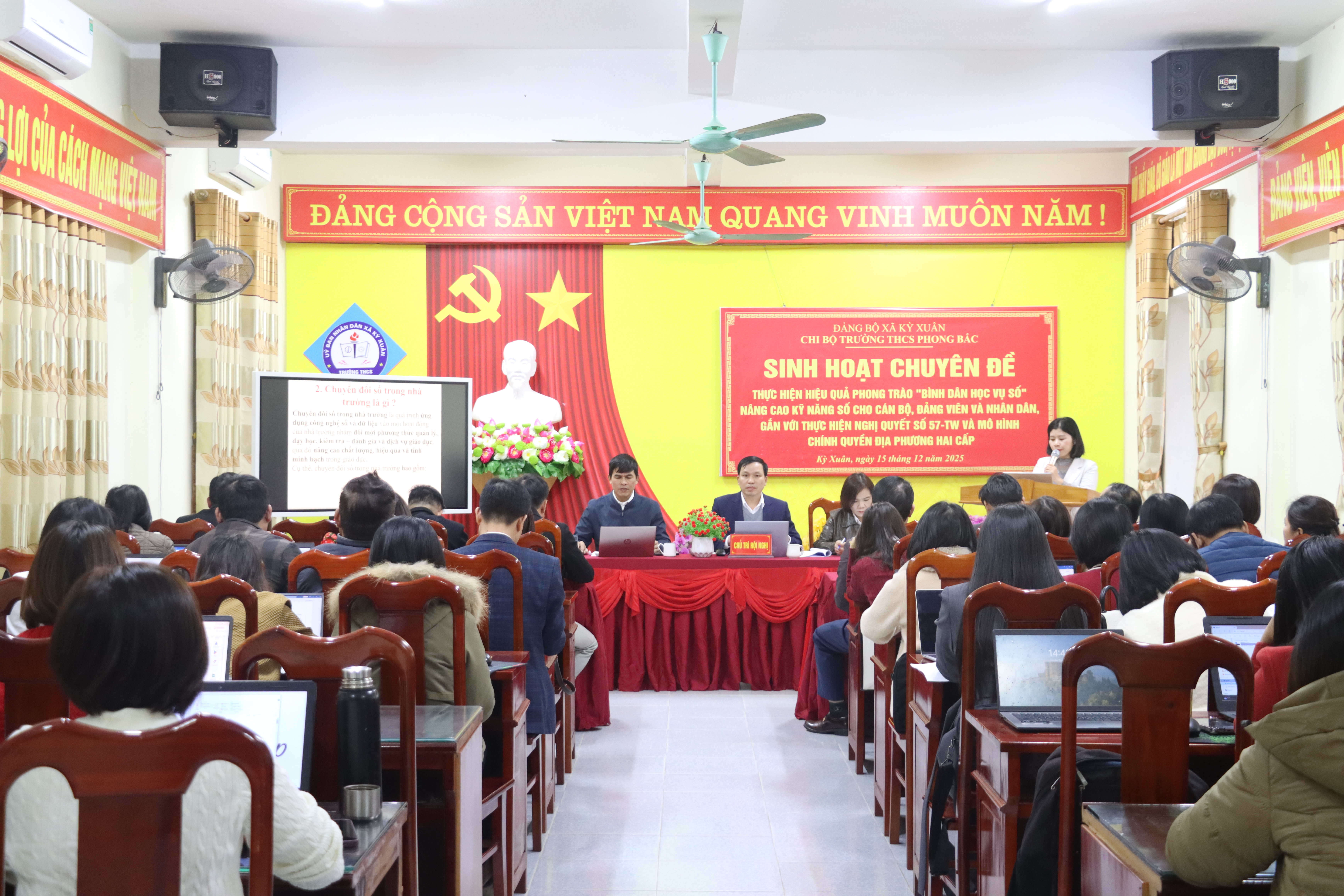 Theo đó, trong thời gian qua, cấp ủy chi bộ, ban giám hiệu nhà trường THCS Phong Bắc nhận thức được tầm quan trọng của Chuyển đổi số trong trường học; đội ngũ cán bộ đảng viên nhiệt huyết, tích cực học tập và ứng dụng chuyển đổi số, CNTT trong dạy học. Phụ huynh, học sinh nhận thức được tính cấp thiết về chuyển đổi số trong cuộc sống hằng ngày và trong học tập. Đồng thời, 100% giáo viên soạn kế hoạch bài dạy, kế hoạch giáo dục bằng bản mềm điện tử. 80% dạy học bằng bài giảng điện tử, có ứng dụng công nghệ AI. 100% lớp học có thiết bị tivi thông minh, khai thác học liệu điện tử, sách mềm. 100% giáo viên sử dụng hồ sơ điện tử như sổ đầu bài, sổ điểm, sổ chủ nhiệm. 70% công tác thanh toán, chi trả, tiếp nhận, đóng nộp các khoản không dùng tiền mặt. 100% học sinh biết sử dụng nền tảng học tập trực tuyến. 50% thực hiện đọc sách điện tử, tra cứu sách điện tử; tiến hành việc đăng ký mượn sách, trả sách qua phần mềm thư viện. 80% minh chứng về Kiểm định chất lượng đã số hoá, tiến tới hoàn thành Kiểm định chất lượng không bản giấy.