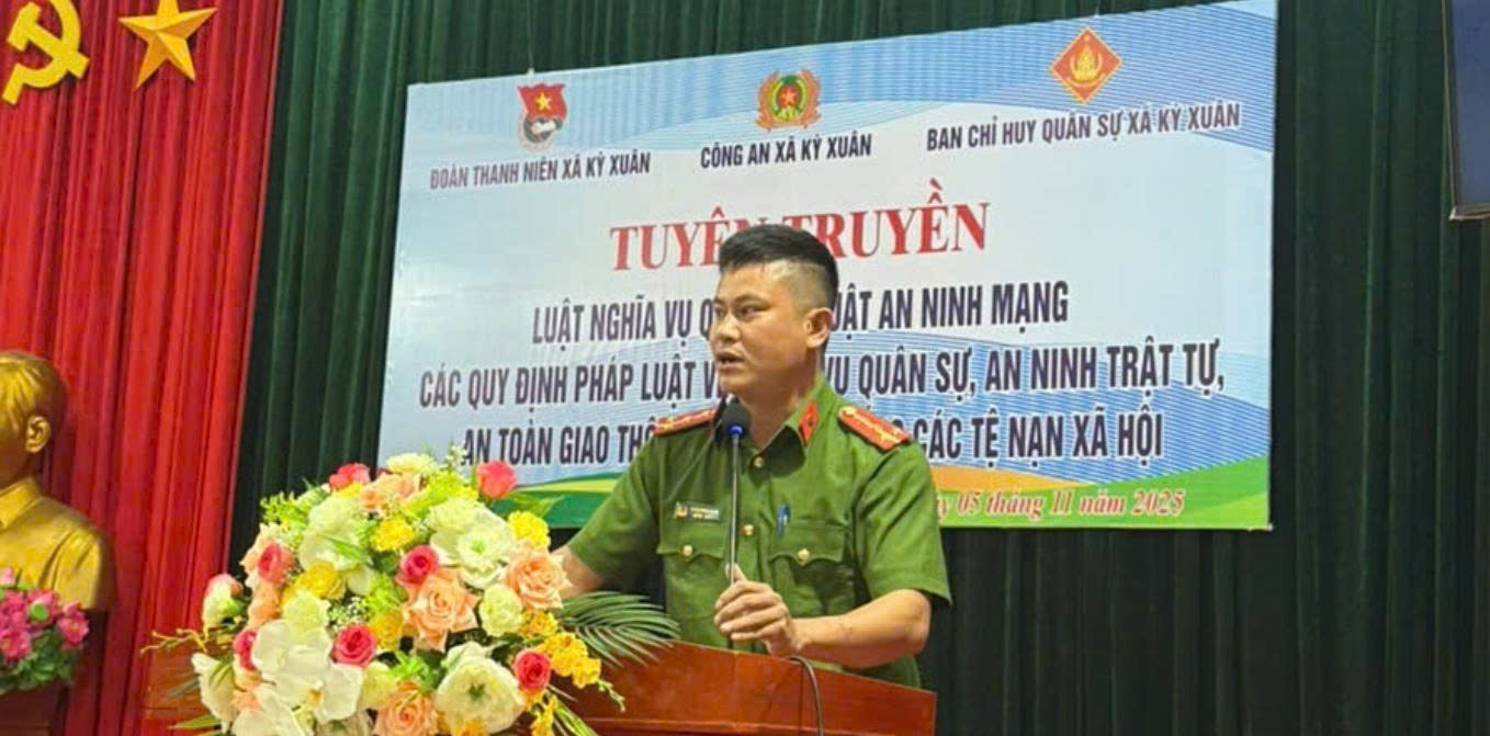 (Đ/c Trần Minh Công – Cán bộ Công an xã Kỳ Xuân, tuyên truyền về an ninh trật tự và an toàn giao thông).