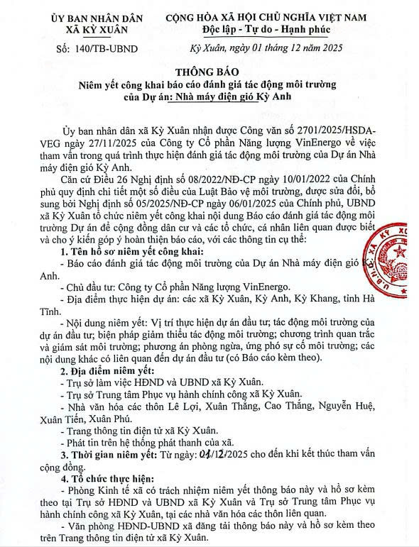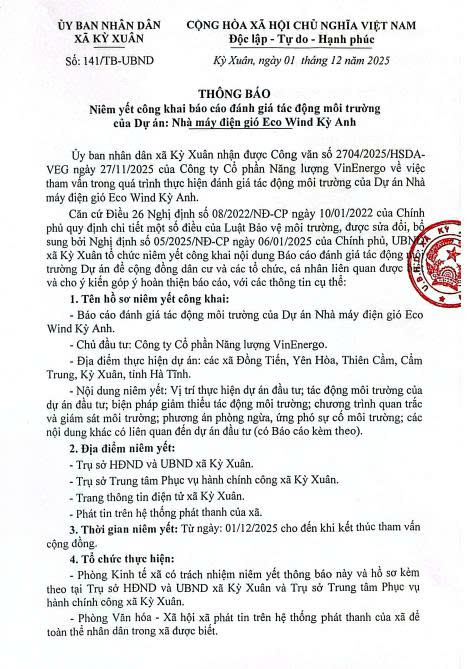 THÔNG BÁO NIÊM YẾT CÔNG KHAI BÁO CÁO ĐÁNH GIÁ TÁC ĐỘNG MÔI TRƯỜNG DỰ ÁN NHÀ MÁY ĐIỆN GIÓ KỲ ANH VÀ NHÀ MÁY ĐIỆN GIÓ ECO WIND KỲ ANH