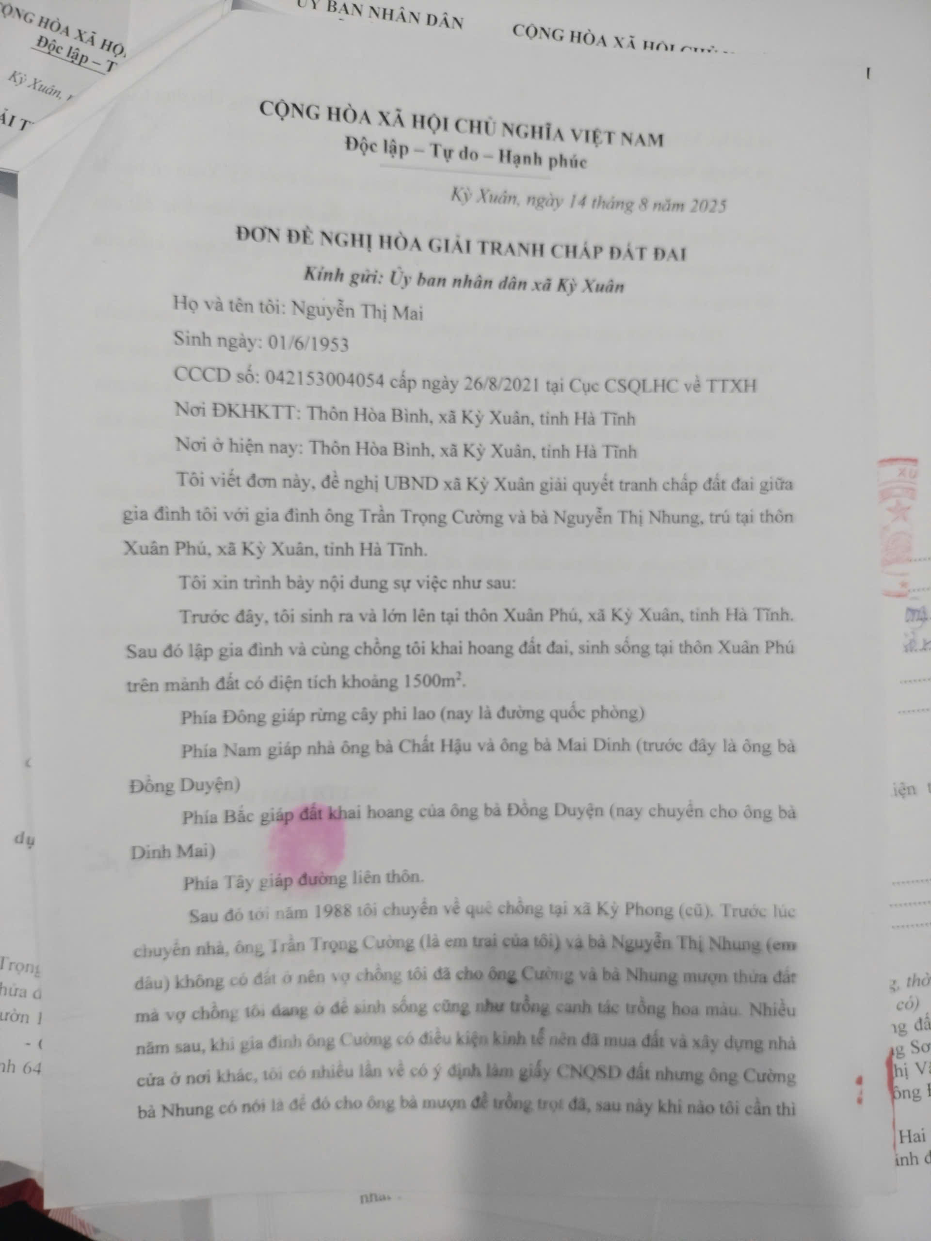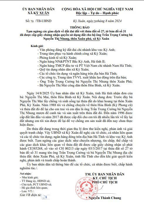 Tạm ngừng các giao dịch về đất đai đối với thửa đất số 27, tờ bản đồ số 31đã được cấp giấy chứng nhận quyền sử dụng đất cho hộ ông Trần Trọng Cường bà Nguyễn Thị Nhung, thôn Xuân phú, xã Kỳ Xuân (kèm thông báo và đơn thư)