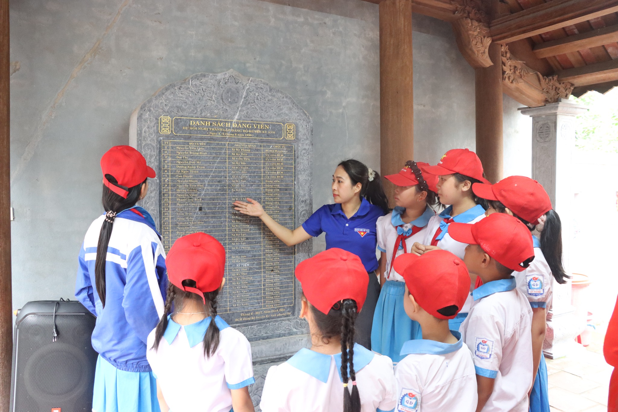 Phần giáo dục trải nghiệm đã làm sống dậy lịch sử ngay tại di tích. Dưới sự dẫn dắt của cô giáo Viên Thị Ngân, Đền Phương Giai hiện lên không chỉ là nơi thờ tự, mà còn là dấu mốc lịch sử quan trọng - nơi diễn ra Hội nghị thành lập Đảng bộ huyện Kỳ Anh tháng 6/1930. Không còn là những trang sách khô cứng, lịch sử được tiếp cận bằng trải nghiệm. Học sinh chủ động lắng nghe, trao đổi, đặt câu hỏi, tạo nên không khí học tập sinh động. Cao trào chương trình là hoạt cảnh tái hiện sự hy sinh của đồng chí Nguyễn Trọng Bình. Không gian lắng lại, nhiều học sinh xúc động. Lịch sử từ đó trở nên gần gũi, chân thực.