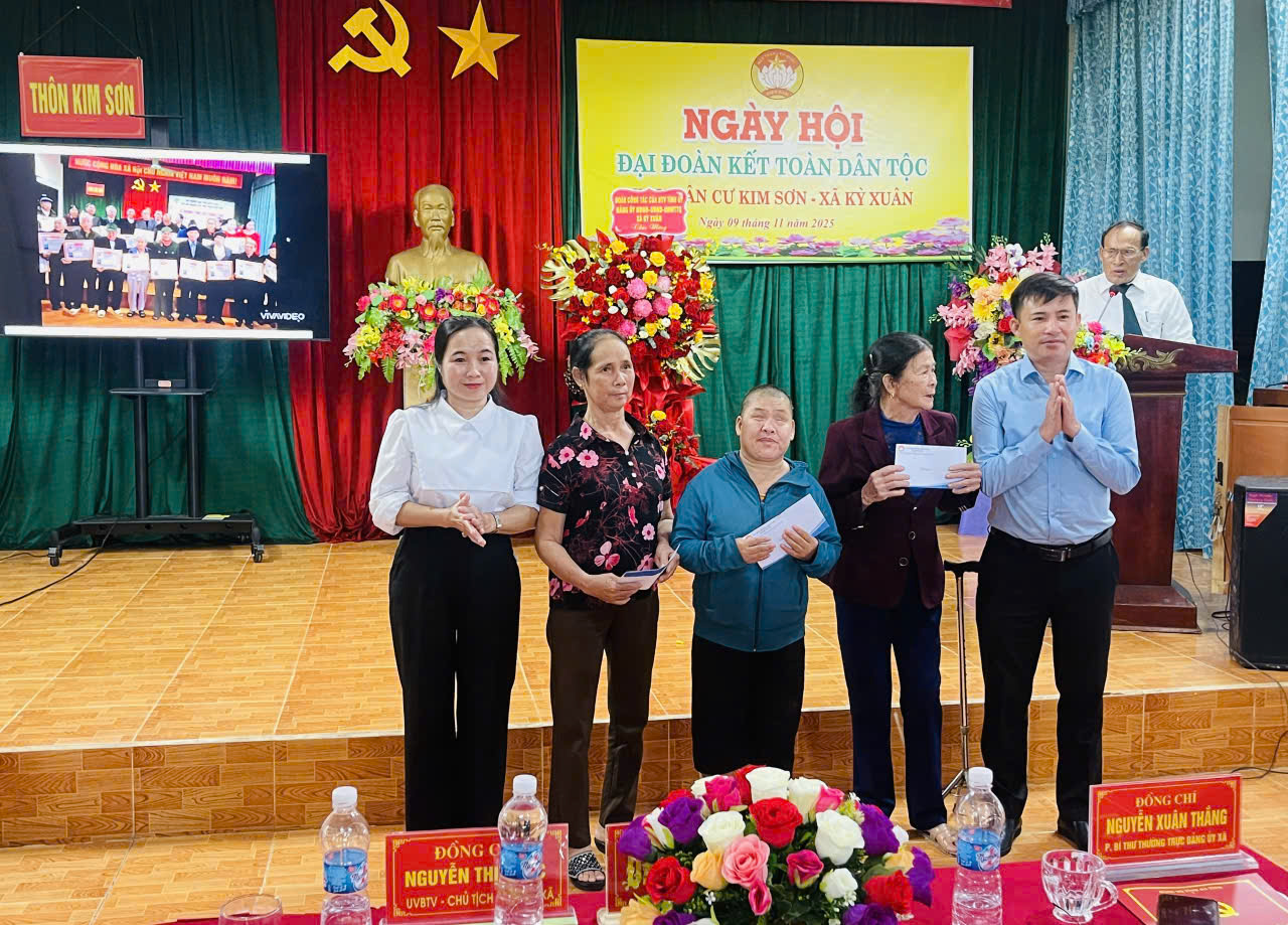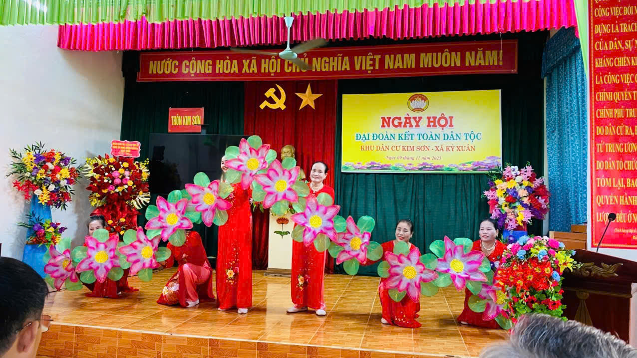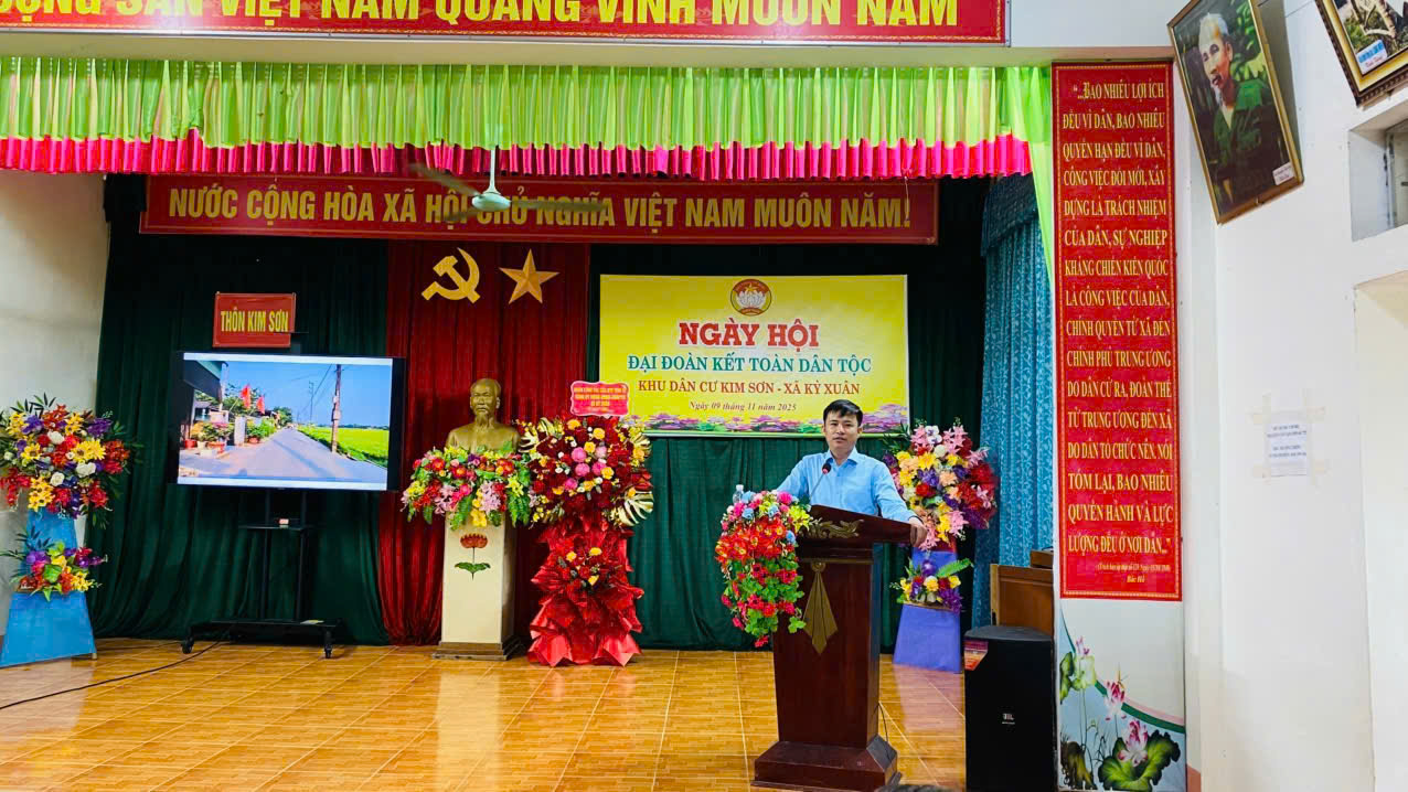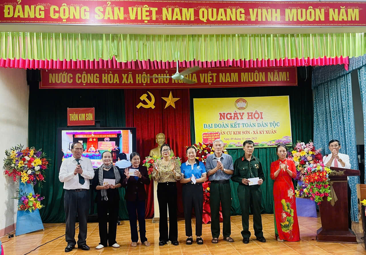 Chiều ngày 9/11/2025 Ban công tác mặt trận thôn Kim Sơn, xã Kỳ Xuân tổ chức thành công ngày Hội Đại đoàn kết toàn dân tộc. Về tham dự và chung vui cùng ngày hội có đồng chí Nguyễn Xuân Thắng- Phó bí thư Thường trực Đảng uỷ, đc Dương Xuân Sáu - UVBTV - Trưởng Ban Xây dựng Đảng; đc Nguyễn Thị Phúc - UV BTV Chủ Tịch MTTQ xã; cùng các đồng chí trong BTV, BCH Đảng uỷ, đại diện lãnh đạo các phòng, ban ngành, chánh văn phòng Đảng uỷ, VP HĐND - UBND, cán bộ công chức cơ quan mặt trận, các ông bà Bí thư chi bộ, Trưởng Ban CTMT các thôn trong toàn xã.