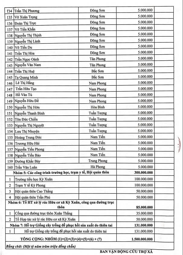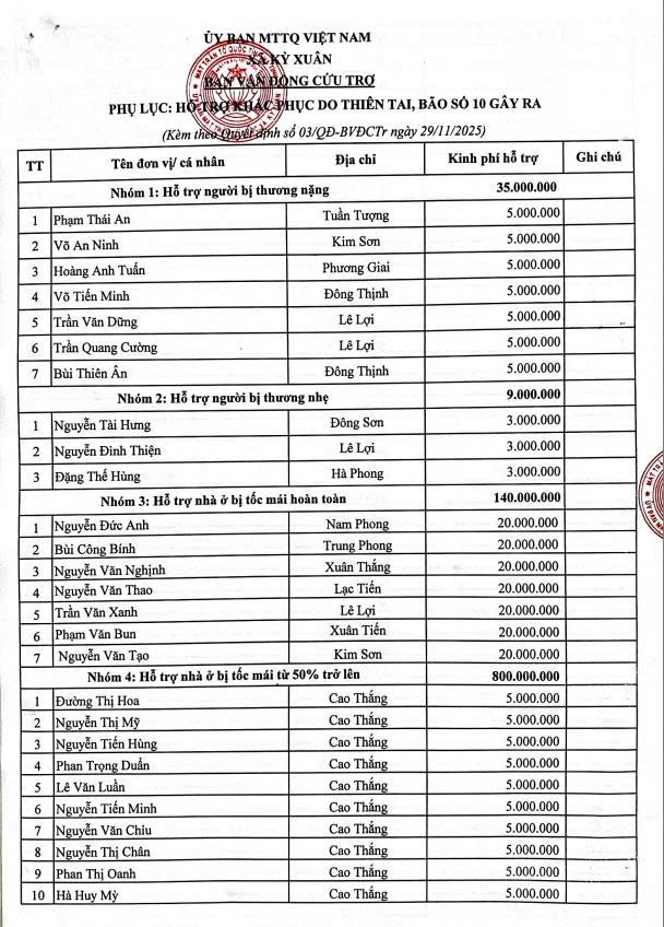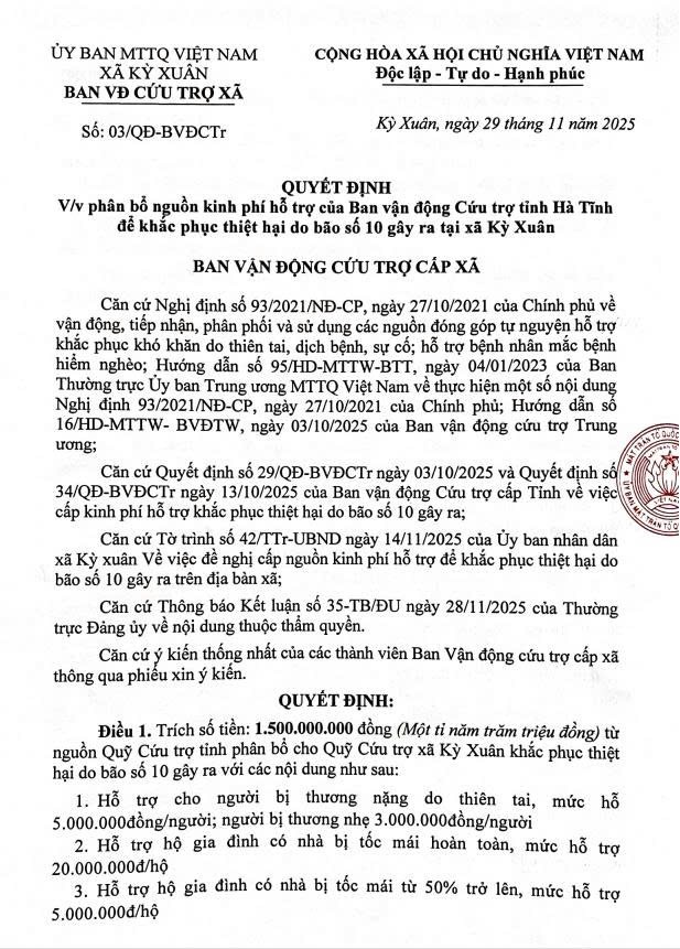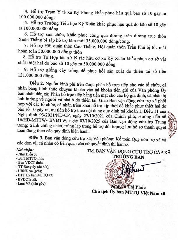 Ngày 04/12/2025 Ủy ban MTTQ Việt Nam xã Kỳ Xuân đã tiến hành công khai các quyết định phân bổ nguồn kinh phí khắc phục thiệt hại do bão số 10 gây ra cho các tổ chức, cá nhân trên địa bàn. Tổng số nguồn kinh phí hỗ trợ 1.500.000.000 (Bằng chữ: Một tỷ năm trăm triệu đồng) từ nguồn của Ban vận động tỉnh Hà Tĩnh hỗ trợ.