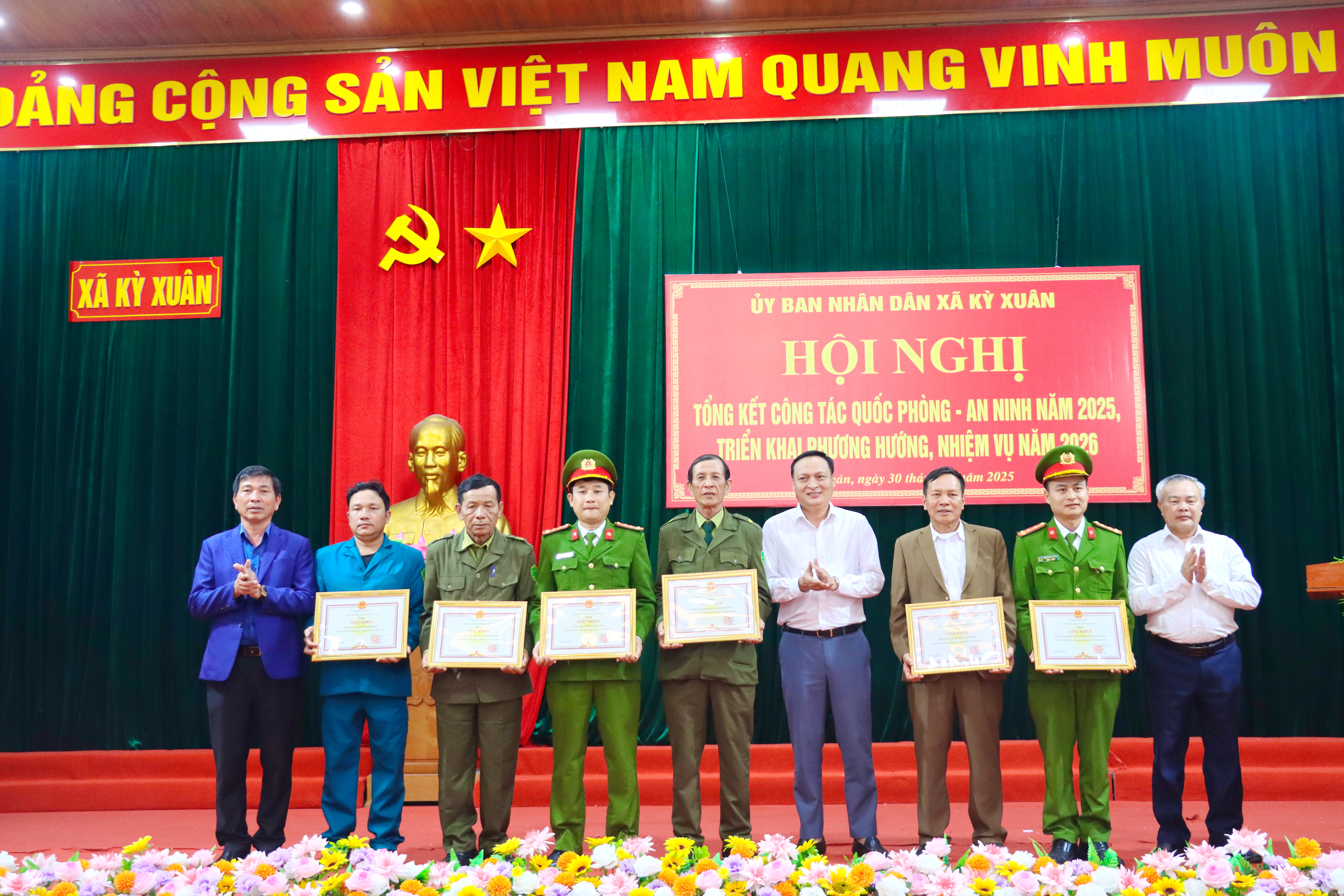 Dịp này, Chủ tịch UBND xã Kỳ Xuân đã khen thưởng 6 tập thể và 8 cá nhân có thành tích xuất sắc trong công tác Quốc phòng – An ninh năm 2025.